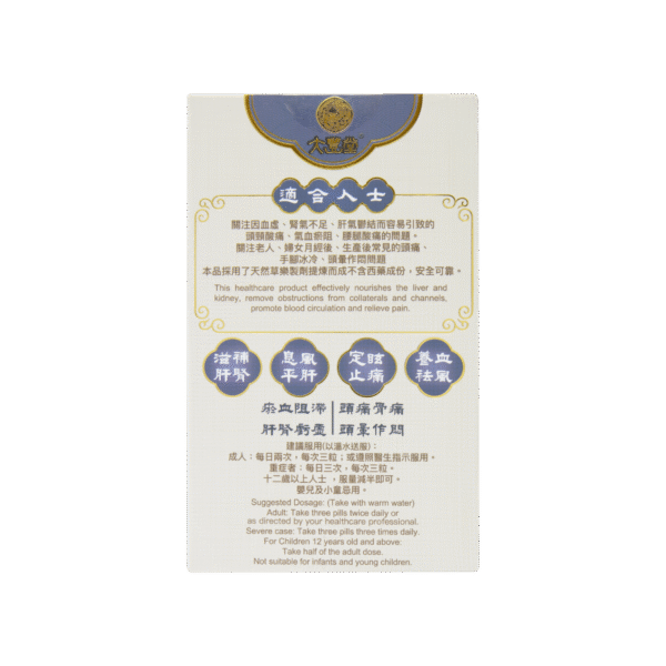 說明:採用天然有效的草本配方,關注因血虛、腎氣不足、肝氣鬱結而容易引致的頭頸酸痛、氣血瘀阻、腰腿酸痛的問題。關注老人、婦女月經後、生產後常見的頭痛、手腳冰冷、頭暈作悶問題。本品採用了天然草藥製劑提煉而成,不含西藥成份,安全可靠。