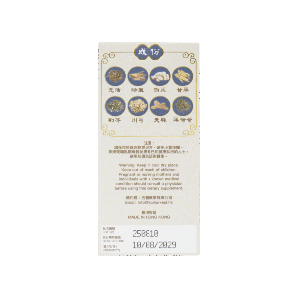 成分: 天麻、白芷、川芎、羌活、防風、甘草、荊芥、薄荷葉。