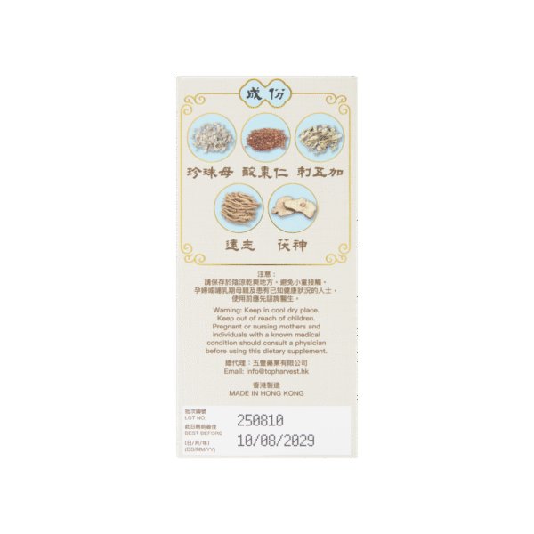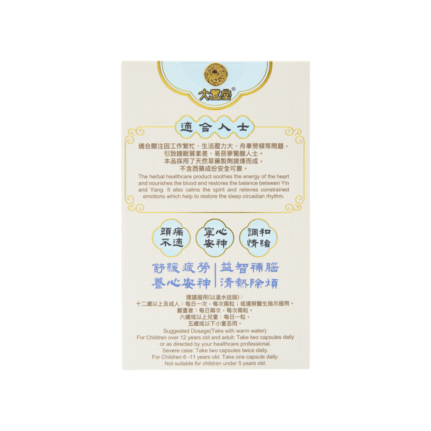 說明:採用天然有效的草本配方,適合關注因工作繁忙、生活壓力大、舟車勞頓等問題,引致睡眠質素差、易惡夢驚醒人士。本品採用了天然草藥製劑提煉而成,不含西藥成份安全可靠。