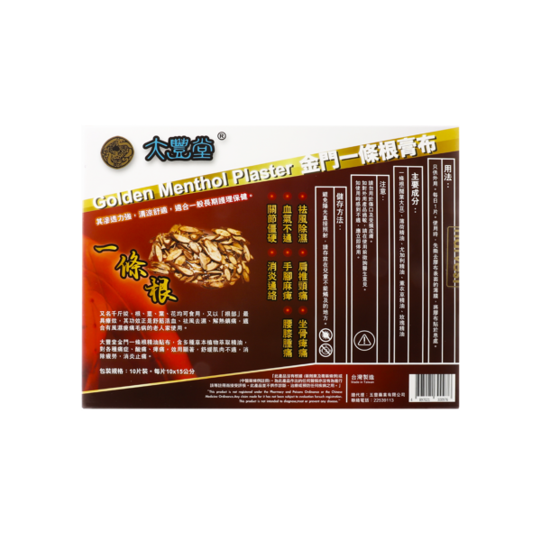 大豐堂金門一條根精油貼布,含多種草本植物萃取精油,對各種痛症、酸痛、痺痛,效用顯著,舒緩肌肉不適,消除疲勞,消炎止痛。其滲透力強,清涼舒適,適合關節僵硬、手腳麻痺、腰膝腫痛、肩椎頸痛、祛風除濕、血氣不通、 消炎通絡及坐骨痺痛等長期護理保健。