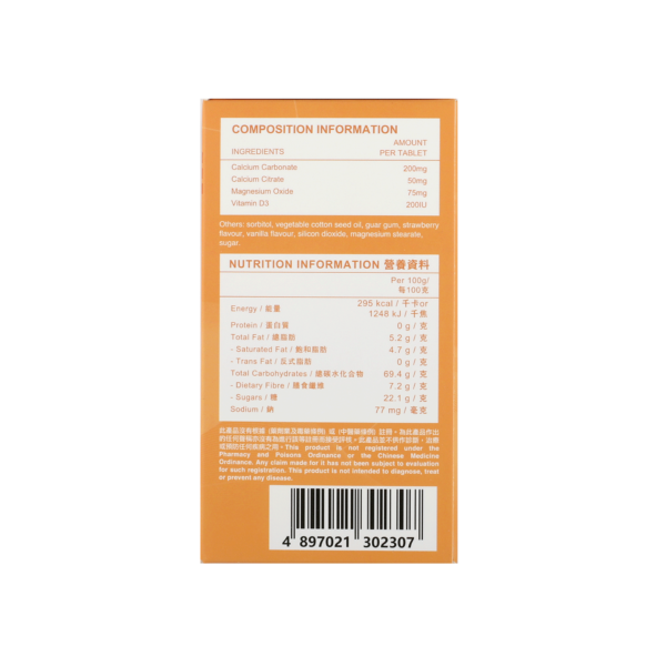 成分(每片):Calcium Carbonate 200mg, Calcium Citrate 50mg, Magnesium Oxide 75mg, Vitamin D3 200IU, Others: sorbitol, vegetable cotton seed oil, guar gum, strawberry flavour, vanilla flavour, silicon dioxide, magnesium stearate, sugar.